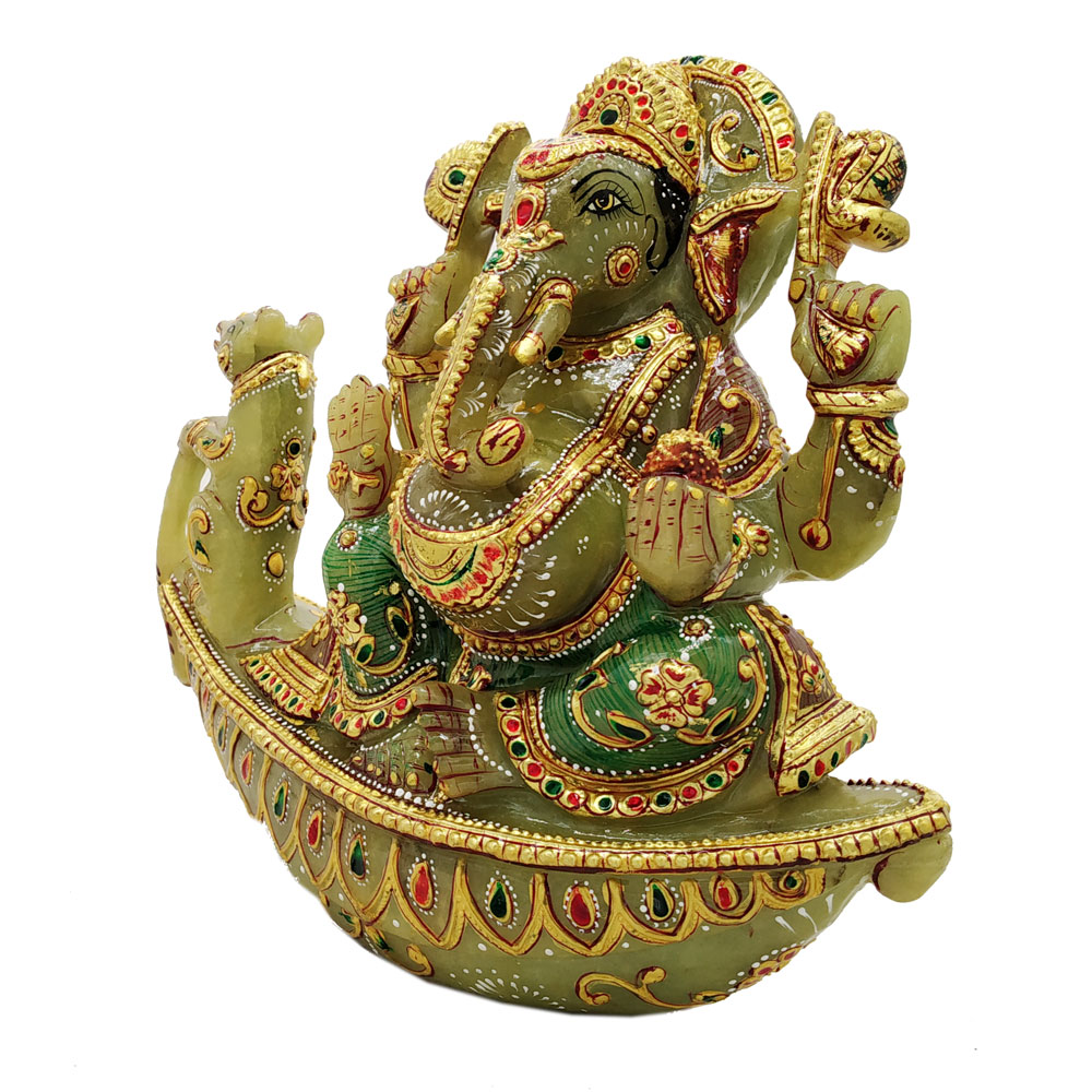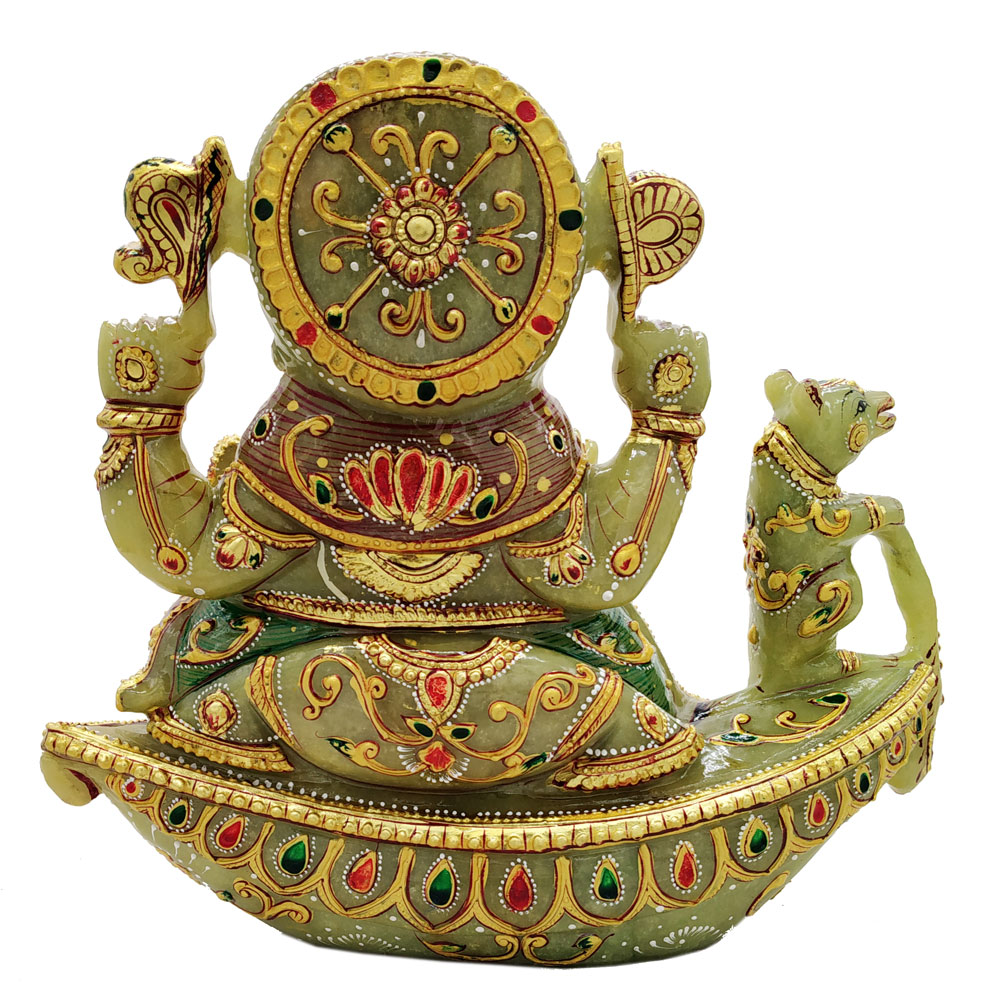 Aventurine Jade Stone Ganesh Sitting on Boat With Mouse Gold Painted Ganesha