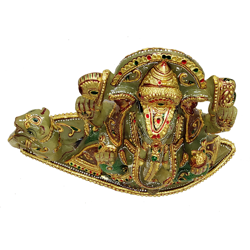 This is Lord Ganesha idol which is made from jade stone and gold Painting comes in attractive green color. This product is hand made and is ideal for home decor