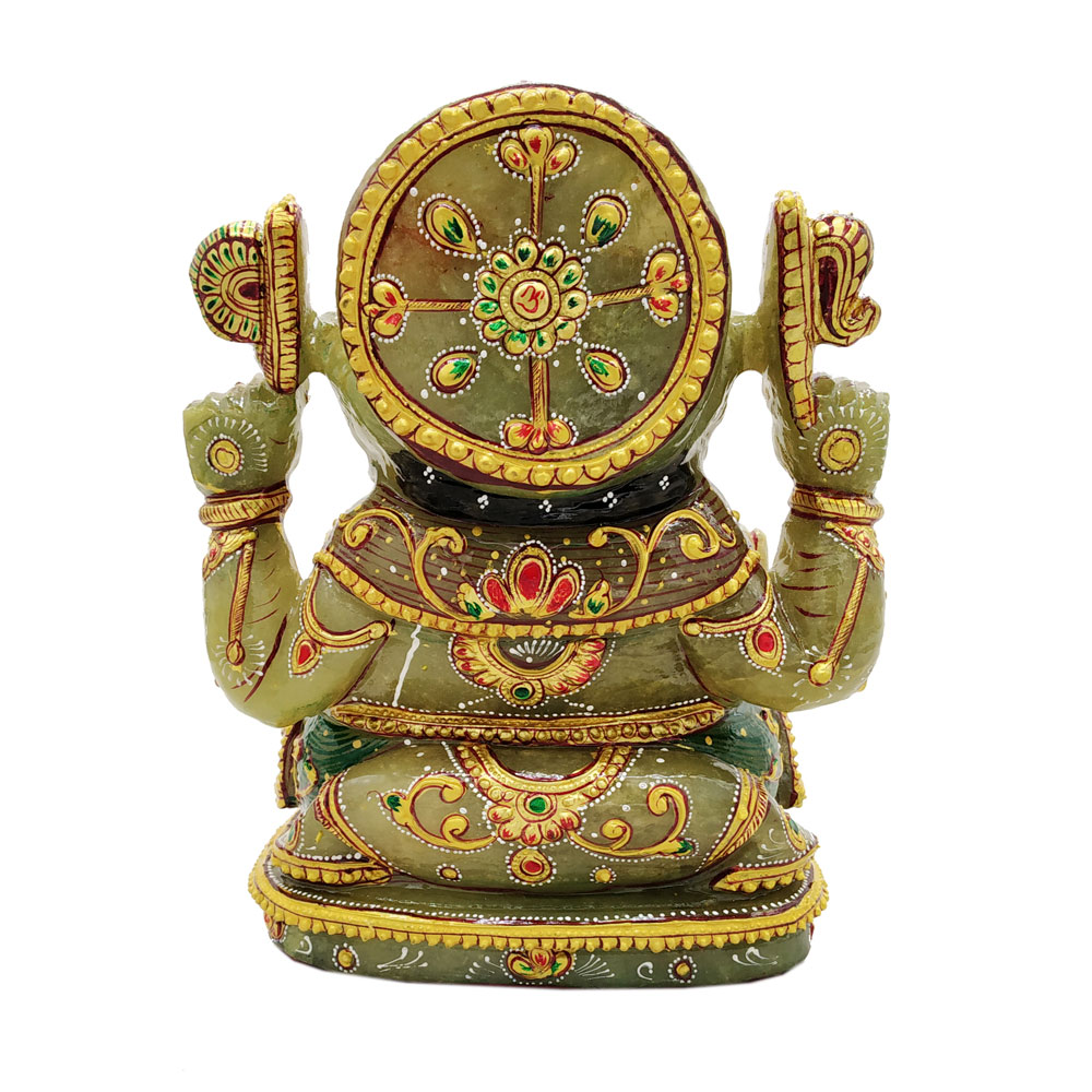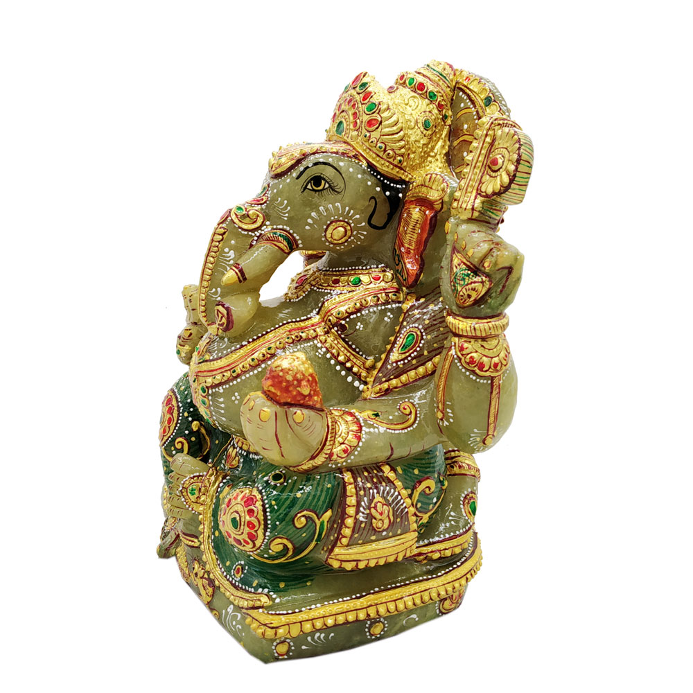 This is Lord Ganesha idol which is made from jade stone and gold Painting comes in attractive green color. This product is hand made and is ideal for home decor