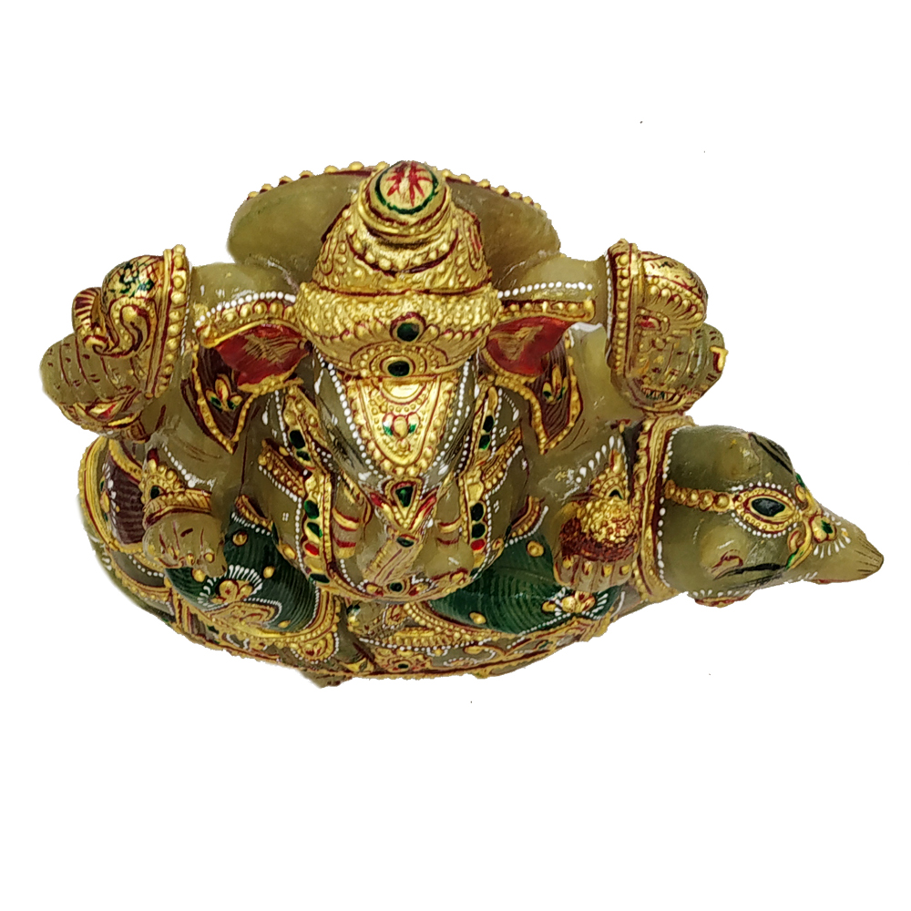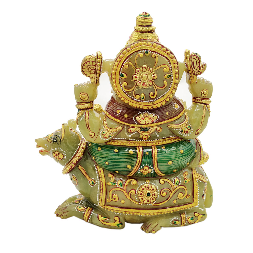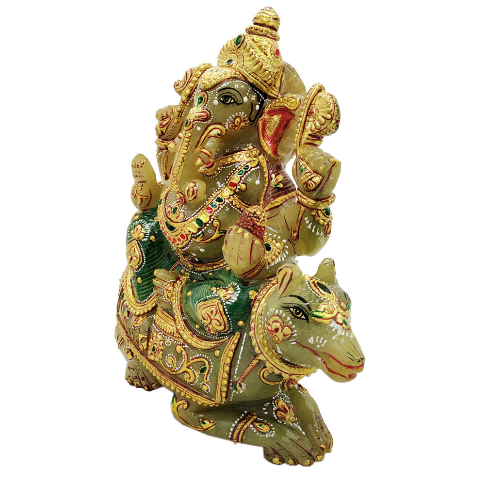 Aventurine Jade Stone Ganesh With Mouse Gold Painted Ganesha