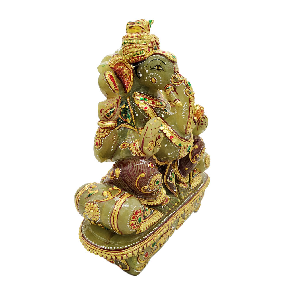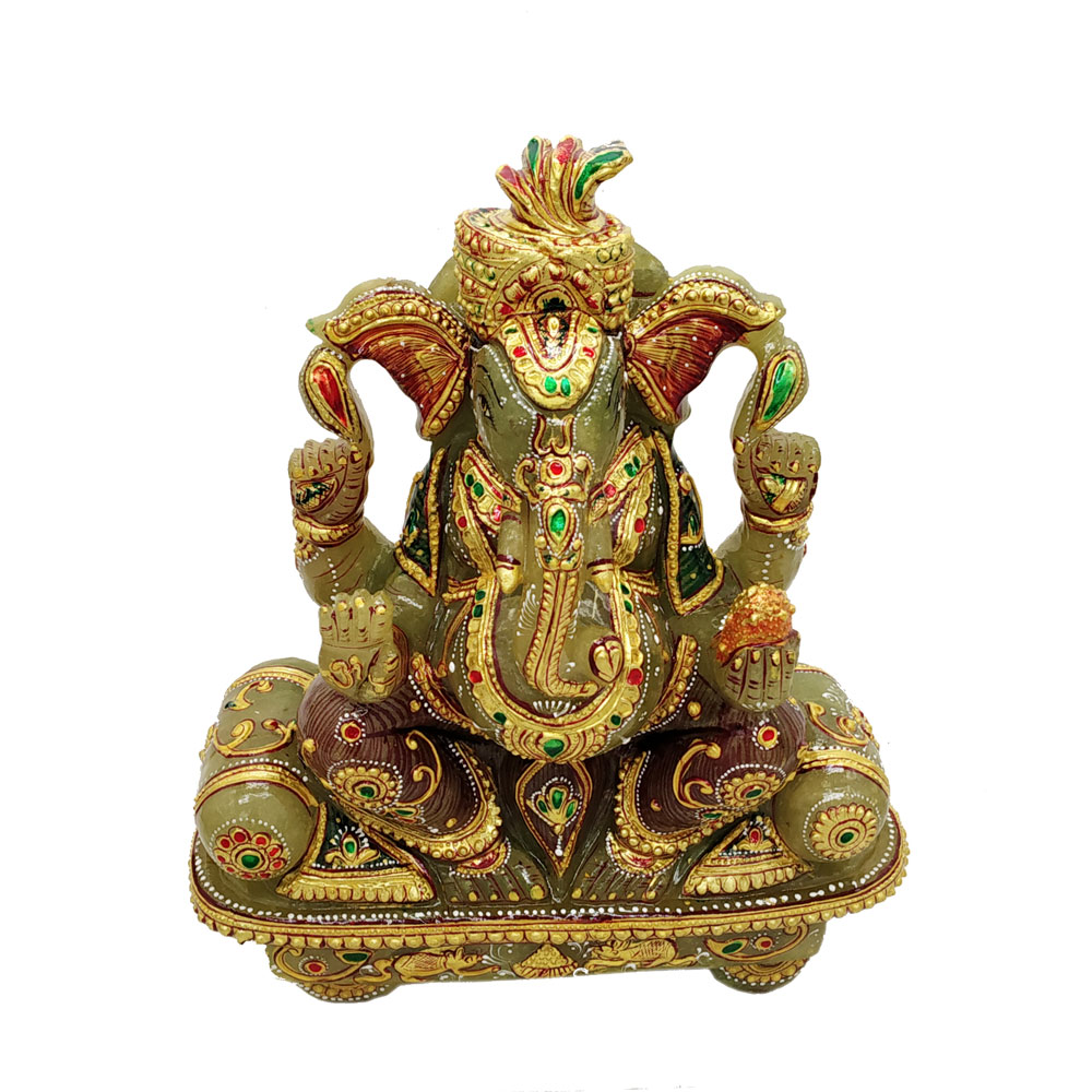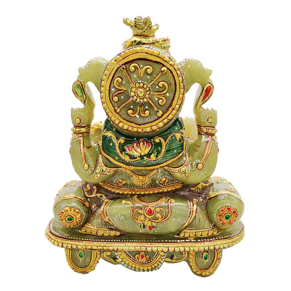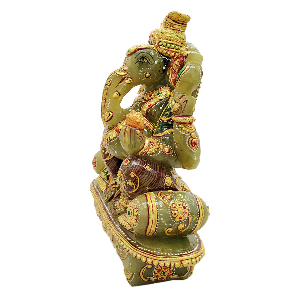 This is Lord Ganesha idol which is made from jade stone and gold Painting comes in attractive green color. This product is hand made and is ideal for home decor