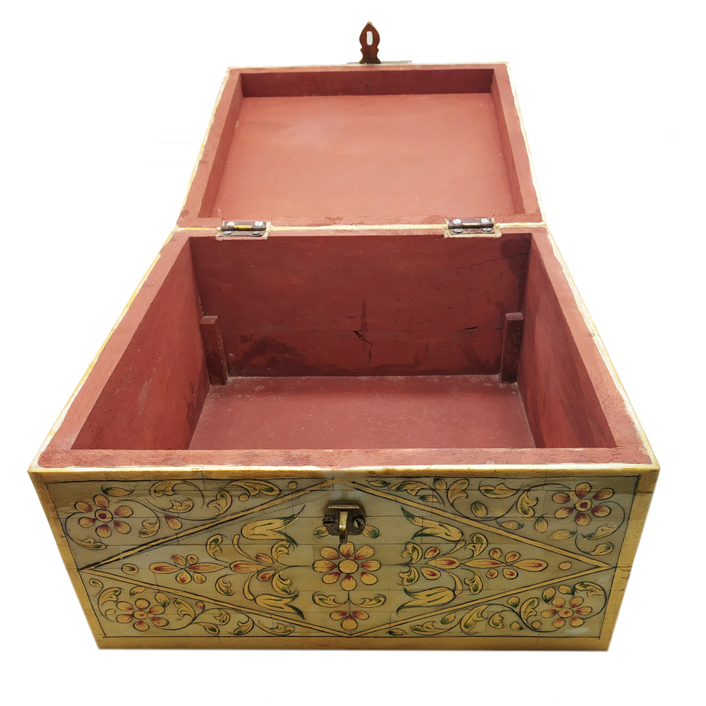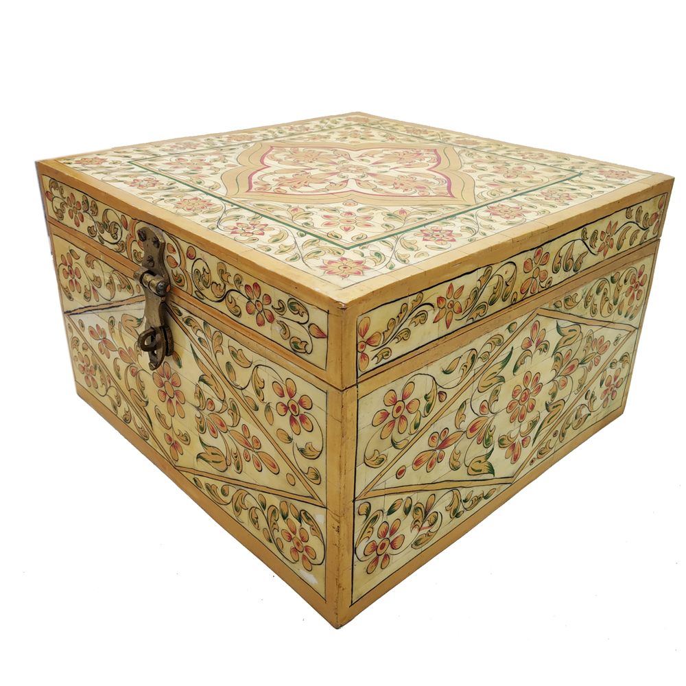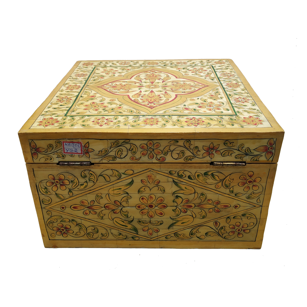 Each piece has been handcrafted in a process that can take weeks using honorably sourced camel bone. Delicate carved pieces of bone have been individually inlaid onto a wooden frame in an elaborate floral pattern. Layers of colored Bone are then used to fill around the bone. Finally the backside and inside areas are painted with the matching colors.