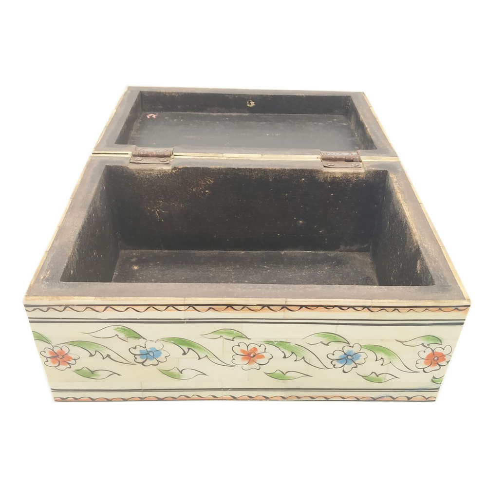 Each piece has been handcrafted in a process that can take weeks using honorably sourced camel bone. Delicate carved pieces of bone have been individually inlaid onto a wooden frame in an elaborate floral pattern. Layers of colored Bone are then used to fill around the bone. Finally the backside and inside areas are painted with the matching colors.