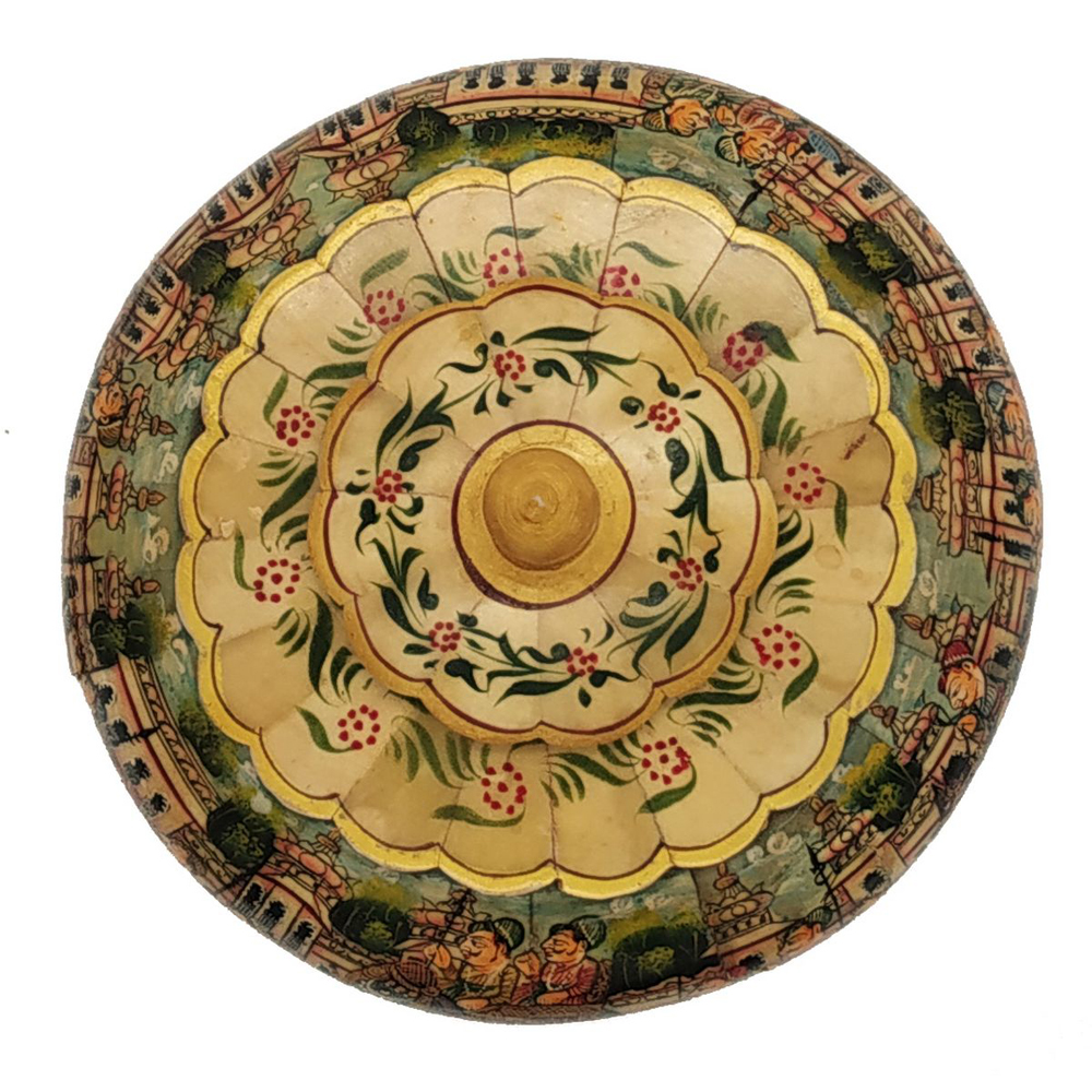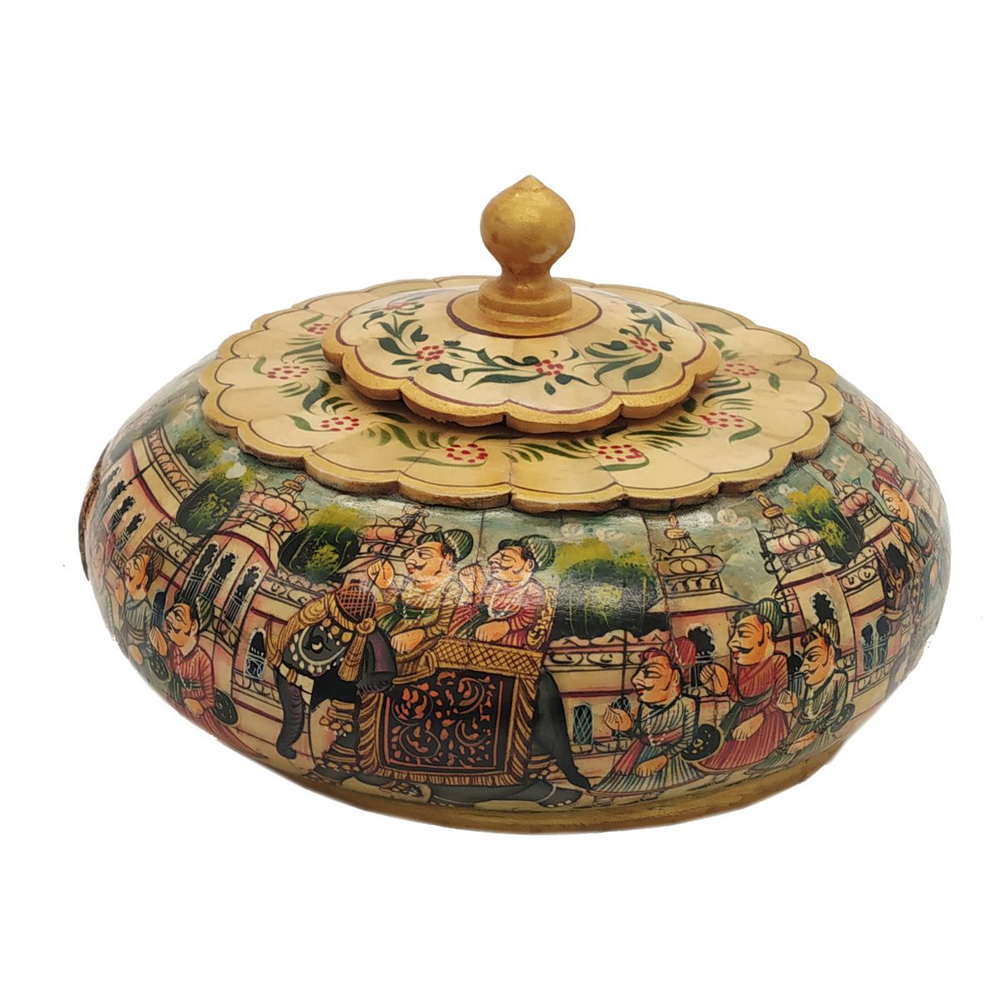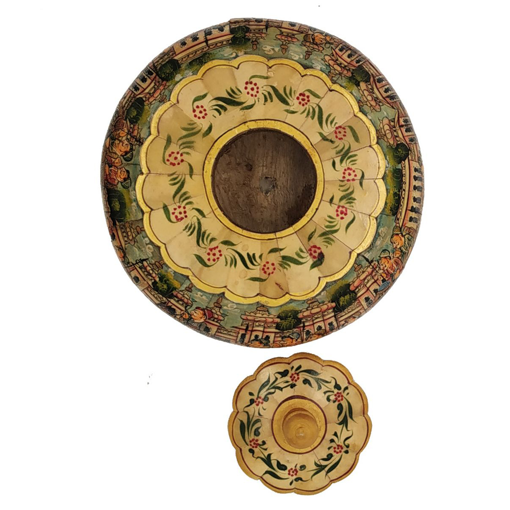 Each piece has been handcrafted in a process that can take weeks using honorably sourced camel bone. Delicate carved pieces of bone have been individually inlaid onto a wooden frame in an elaborate floral pattern. Layers of colored Bone are then used to fill around the bone. Finally the backside and inside areas are painted with the matching colors.