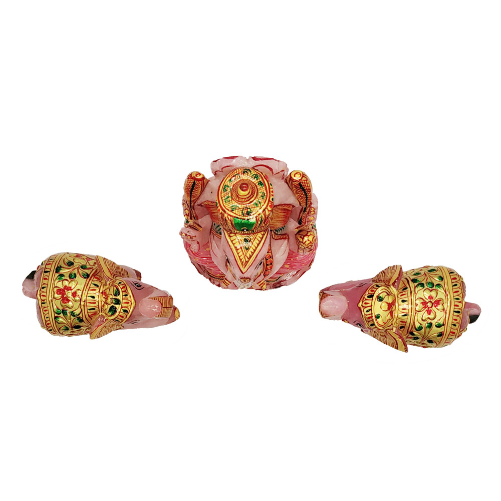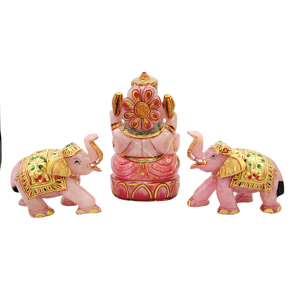 This is Lord Ganesha with two Elephant idol which is made from Rose Quartz stone and gold Painting comes in attractive green color. This product is hand made and is ideal for home decor