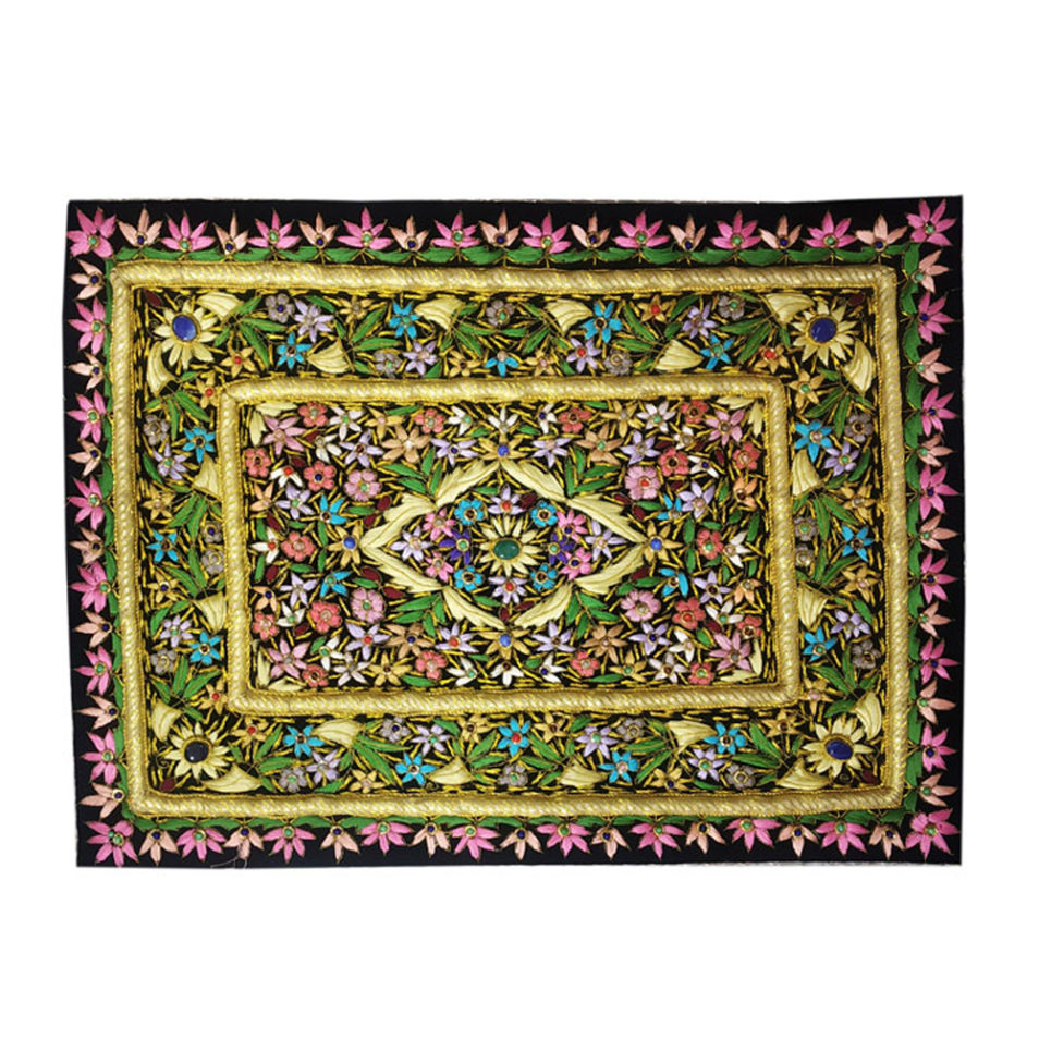 This is Beautiful spectacular is amazing collage of fine Zardozi embroidery accented with semi-precious stones.The sparkling Zardozi embellishments in gold & copper work will lend a spectacularly ethnic look and add style to your room & wall with the royal grandeur of Indian culture.This is a great gift for your Freinad and a genuine Collector.